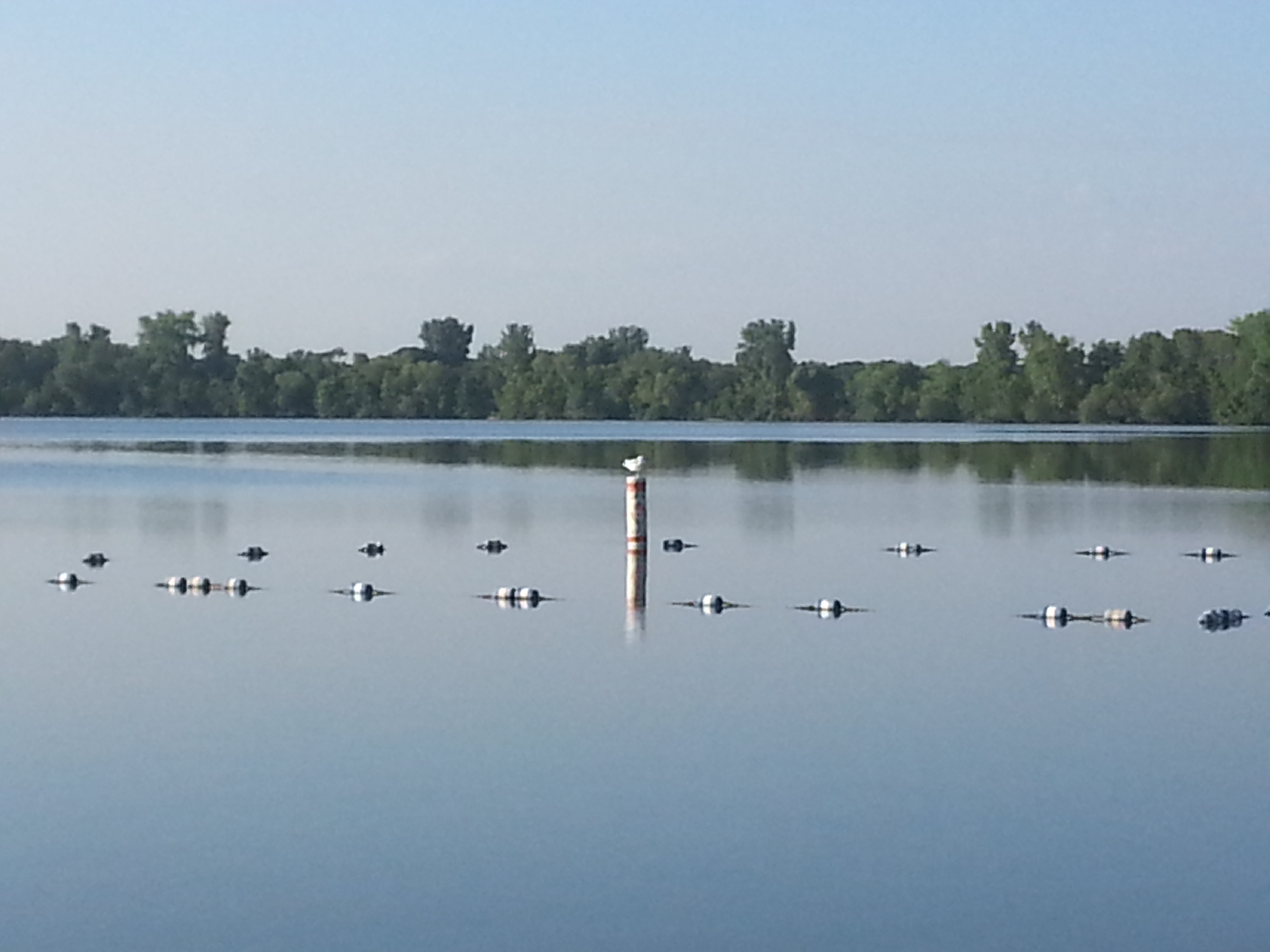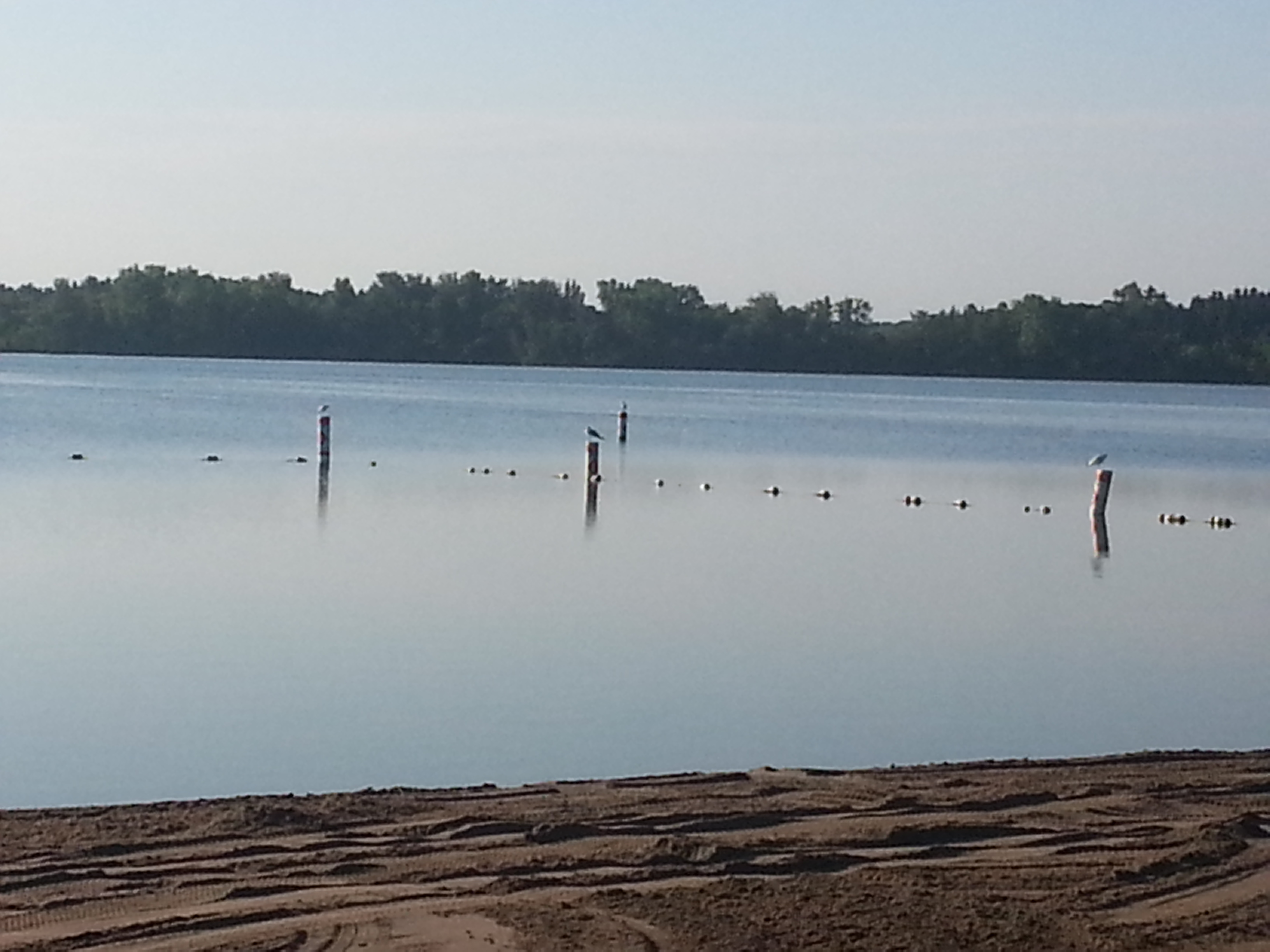 At the swimming lake, the seagulls play bird games on the buoys. The game plays like this: gulls sit on the buoys. Once the buoys are full, other gulls fly at them and try to tag them off. That gull then does the same to others. The laughing gulls find this grand fun as they laugh the entire time the game is played! A loud and fun time!