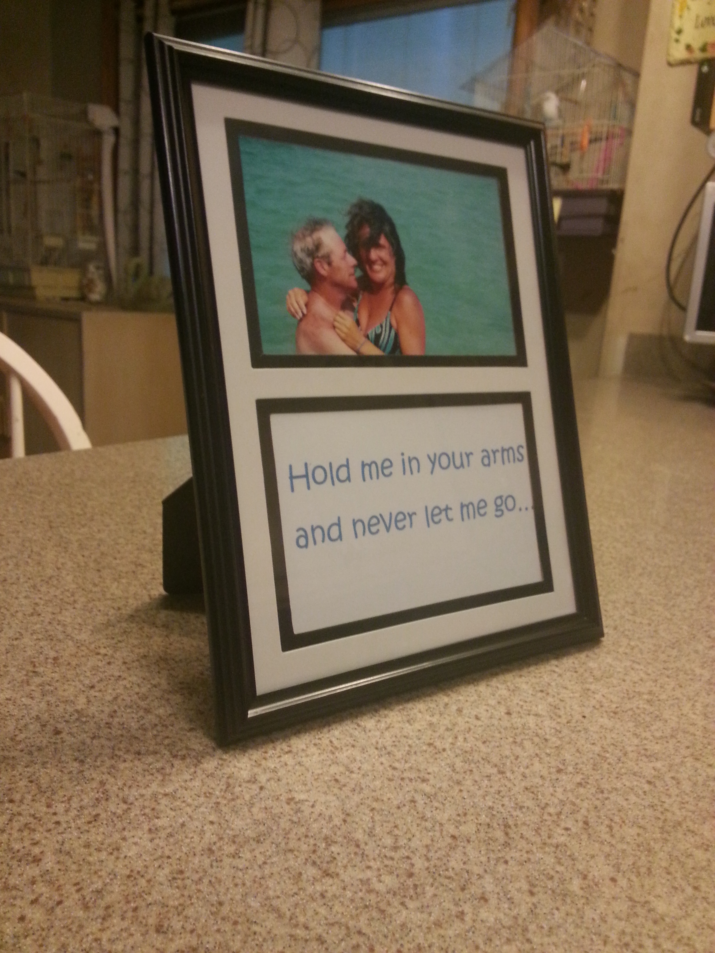 Let us begin. Grab the most recent picture of the two of you, no older than one month! What? You don’t have a recent picture? Create that perfect shot today. Grab your camera and pick your spot. Choose what to wear, yes, you can choose anything! Set your timer and snap some shots, more than one! Think silly photo booth, think faces and kisses and snuggle shots. Laugh and giggle while you do this! Print them out right away! Pick your favorite! What does your picture say to you? Write out a caption- funny, loving, romantic and print it or hand write it!