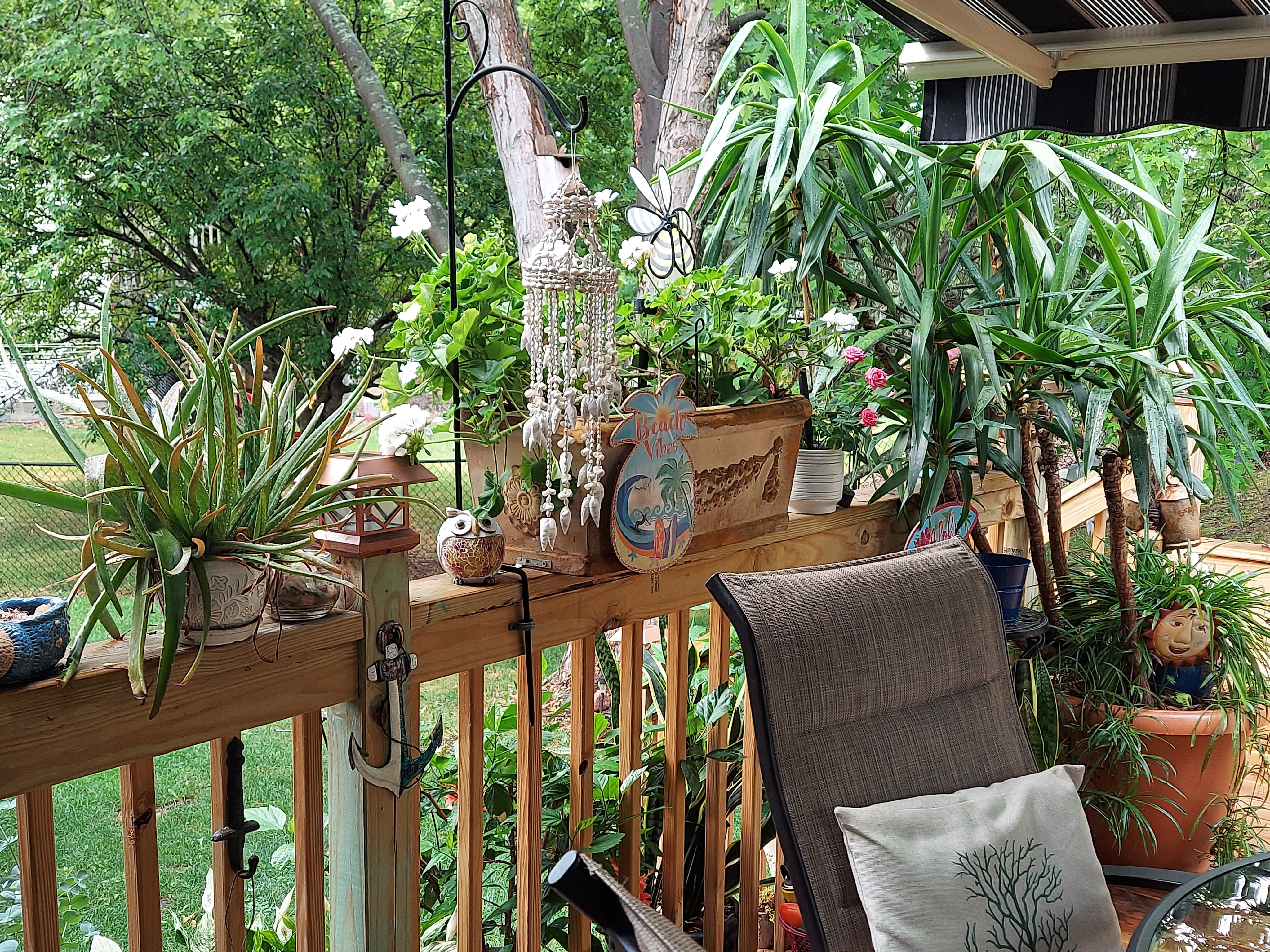 *Add all the decorations! I bring out items that feel like summer. I use all the seashells i have collected over the years and tuck them all around. Old sofa pillows have a new life out on the deck, faded and old looks great outside or get some inexpensive covers to match your vision. Hang bird houses and hummingbird feeders on the branches where you can see them.